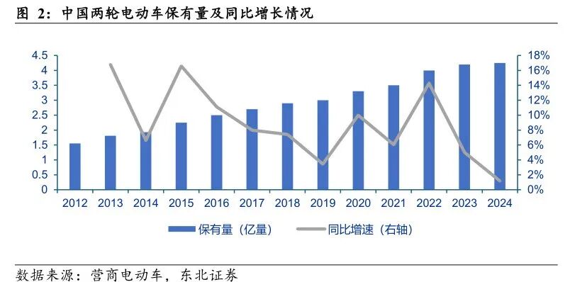 东北证券《中国两轮电动车市场洞察报告》显示,2024年国内两轮电动车保有量已达4.2亿辆,相当于约每三人拥有一辆。