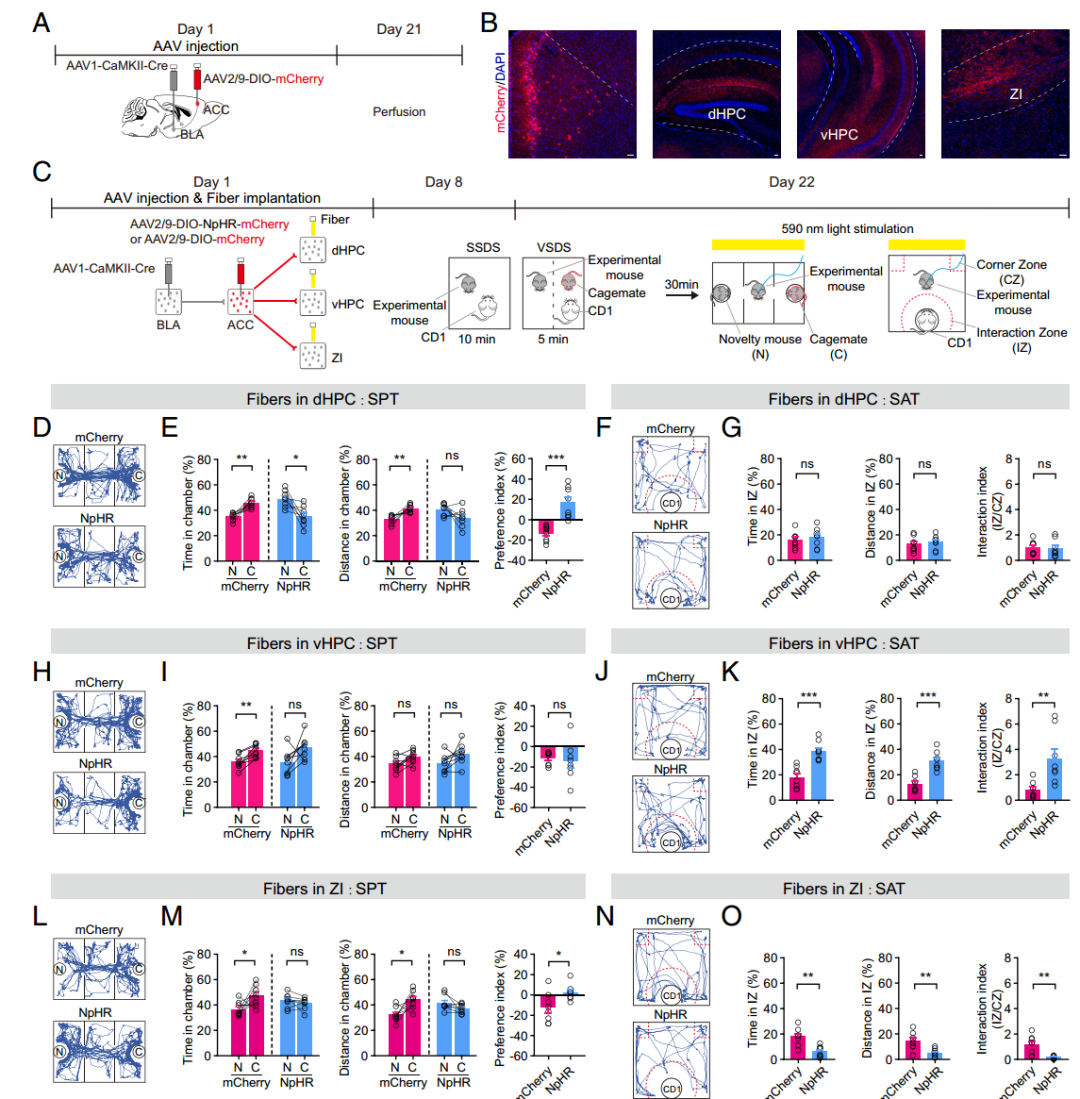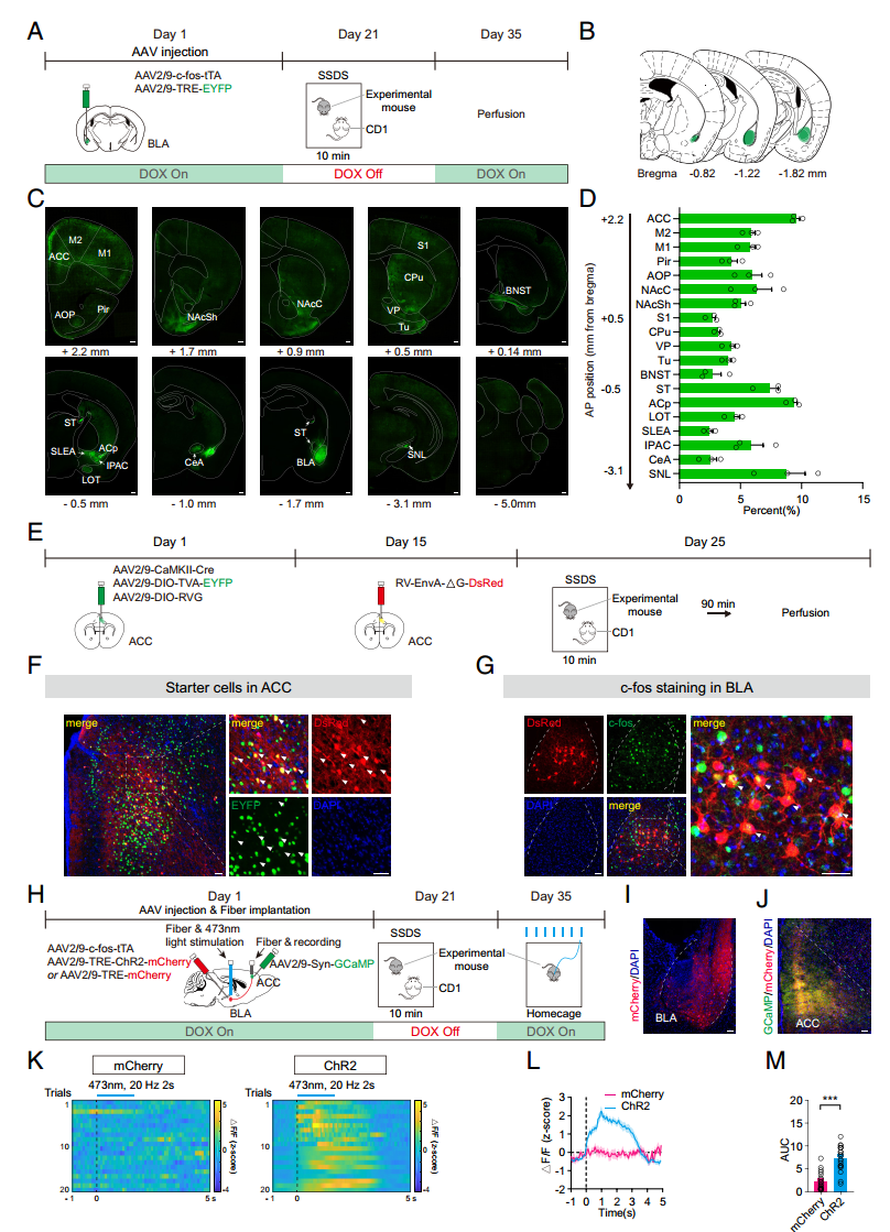 本研究以雄性小鼠为对象,结合SSDS 和 VSDS 构建贴合创伤经历影响社交行为的动物模型,发现基底外侧杏仁核印迹细胞是调控创伤后社交偏好动态的核心,其与前扣带回皮层谷氨酸能神经元形成的回路为关键通路,且该通路向下至背侧海马、腹侧海马、未定带的分支各司其职,分别调控对同经历者的偏好和对施暴者的回避,完整揭示了创伤经历调控社交行为的神经环路机制,为理解社交精神疾病的神经基础提供了新视角。