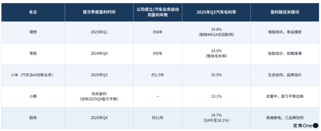 理想用了8年,建立起一套稳固的盈利模型,但这个盈利标杆在2025年遇到重大挑战,进入战略调整期;零跑也用了8年,跑通了低毛利高效率的规模模型;小米用时1年多借助生态优势跑了出来。而蔚来用了11年,终于在最重的模式下,第一次把账算平了。