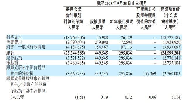 蔚来在全年财报中列出了组织优化费用, 其中Q3为近3亿元 图源 / 蔚来2025年财报