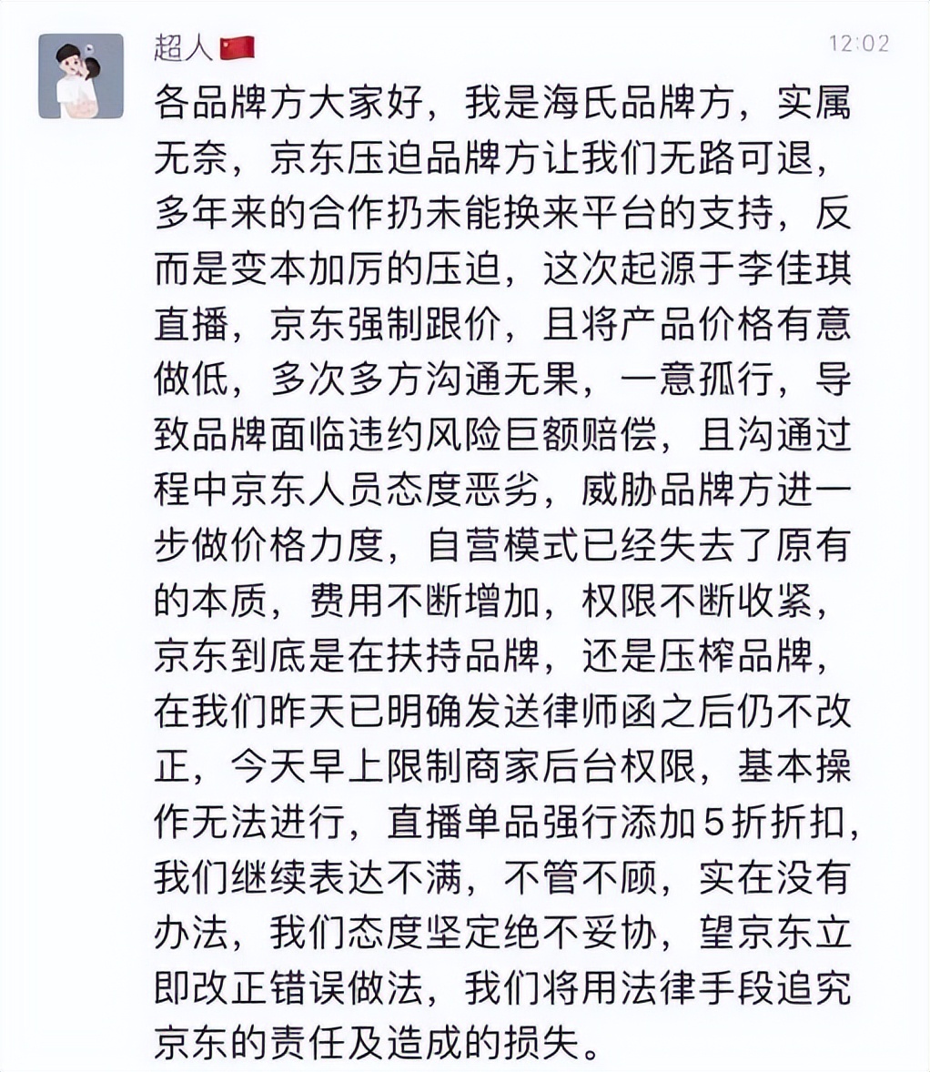 这种压力也演变成了平台与品牌方之间的冲突。比如2023年海氏品牌方宣称自家在京东店铺的某款烤箱价格被京东方面擅自改成了五折,导致其在与其他直播渠道的合作中违约。