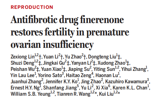 基于此,2026年2月5日,香港大学李嘉诚医学院临床医学院刘奎教授、香港大学深圳医院王天任博士研究团队在国际顶刊《Science》杂志发表了“Antifibrotic drug finerenone restores fertility in premature ovarian insufficiency”揭示了抗纤维化药物非奈利酮可恢复早发性卵巢功能不全患者的生育能力。