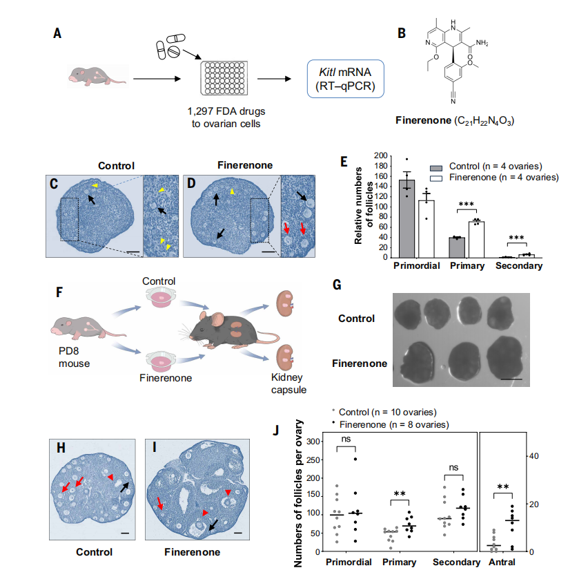 进一步体外培养发现,非奈利酮能让原始卵泡激活并发育成初级、次级卵泡。在卵巢移植实验中,经过非奈利酮处理的卵巢移植后体积更大,长出更多窦卵泡,说明它不仅能启动卵泡激活,还能支持卵泡持续发育成熟。