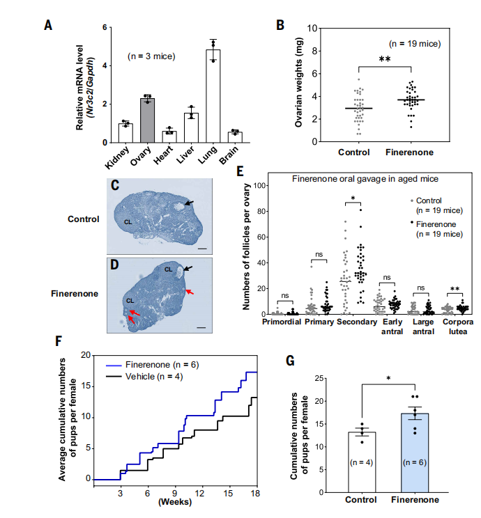 在动物实验中,口服非奈利酮(26 mg/kg,每周两次,连续三周)显著增加雌性小鼠卵巢重量、次级卵泡和黄体数量并在18周生育观察期内提高累计产仔数,表明其可增强生育力。为排除系统性影响,单侧卵巢局部注射非奈利酮后,该侧卵泡发育明显增强,证实其作用可直接发生在卵巢局部。