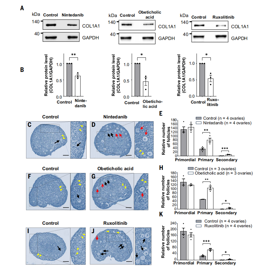 研究发现,非奈利酮能通过抗纤维化作用促进卵泡发育,作者由此推测:其他具有抗纤维化活性的FDA批准口服药也可能有类似效果。为验证这一点,他们测试了五种已上市的抗纤维化药物:尼达尼布、奥贝胆酸、鲁索替尼、帕克替尼和菲卓替尼,它们作用机制各不相同,分别用于治疗肺纤维化、胆汁淤积性肝病或骨髓纤维化。