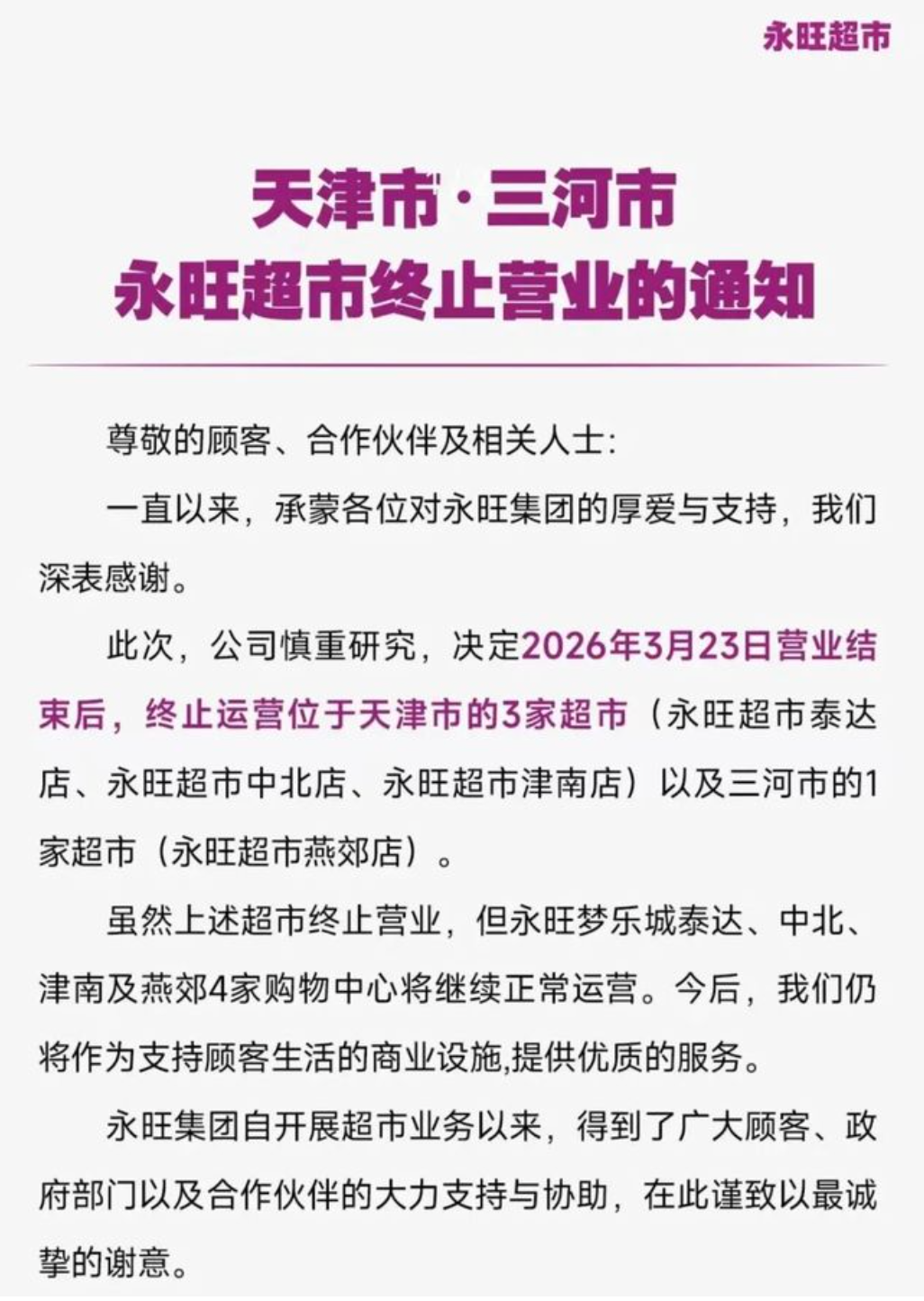 根据永旺的官方公告,天津泰达、中北、津南3家超市及河北燕郊1家超市,将于2026年3月23日正式终止运营。