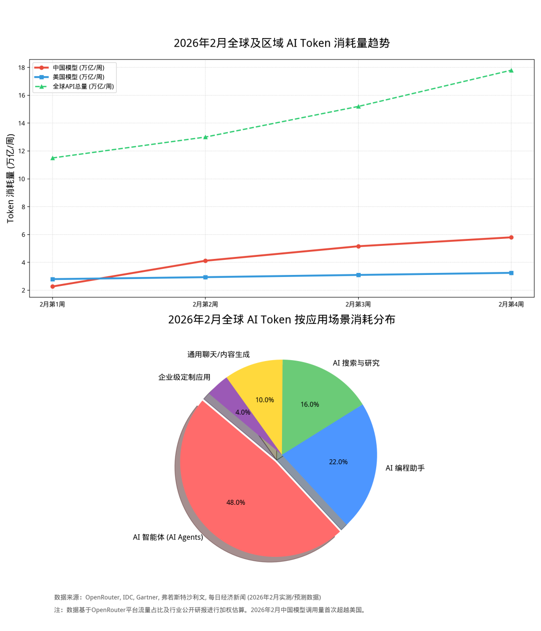 也因此,中国的Token出海正成为一项新产业——在全球最大的AI API聚合平台OpenRouter上,刚过去的2月,MiniMax的M2.5、月之暗面的Kimi K2.5、DeepSeek的V3.2三款国产模型的Token消耗量跻身全球前五;平台前十模型的总Token消耗约38.2万亿,其中中国模型独占17.3万亿,占比45%。