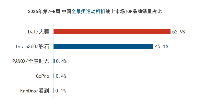 前不久,洛图科技发布《中国运动相机线上零售市场周度追踪》报告称,2026年春节期间,大疆在泛运动相机市场拿下62.9%的销量占比,全景相机市场更是以52.9%的份额实现对影石的反超,其全场景影像矩阵的优势在价格战中被持续放大。