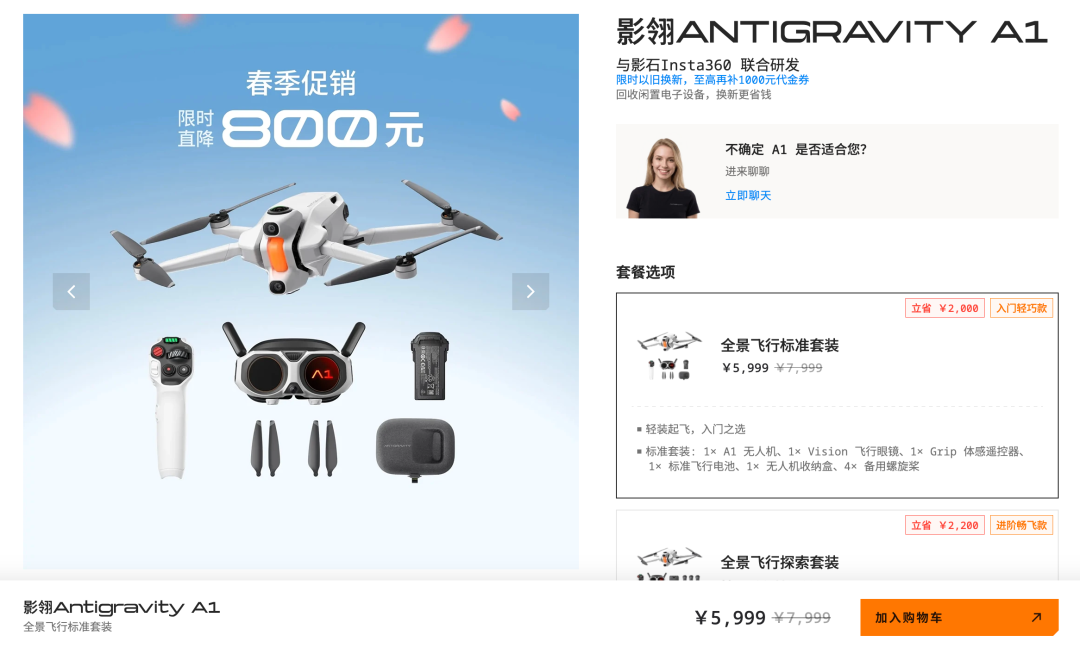 2025年末,影石推出重磅产品全景无人机影翎Antigravity A1,不过,这款产品目前只上线3个月,但全系套装已经开始降价促销,原价7999元的标准套装被下调至5999元。