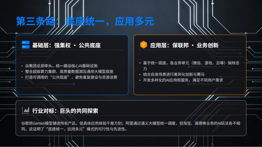 能否在基础层强集权——算力、数据、底层模型统一建设,让集团成为“公共底座”;而在应用层保持联邦制的活力——各业务单元基于同一底座各自创新、各自赛跑?