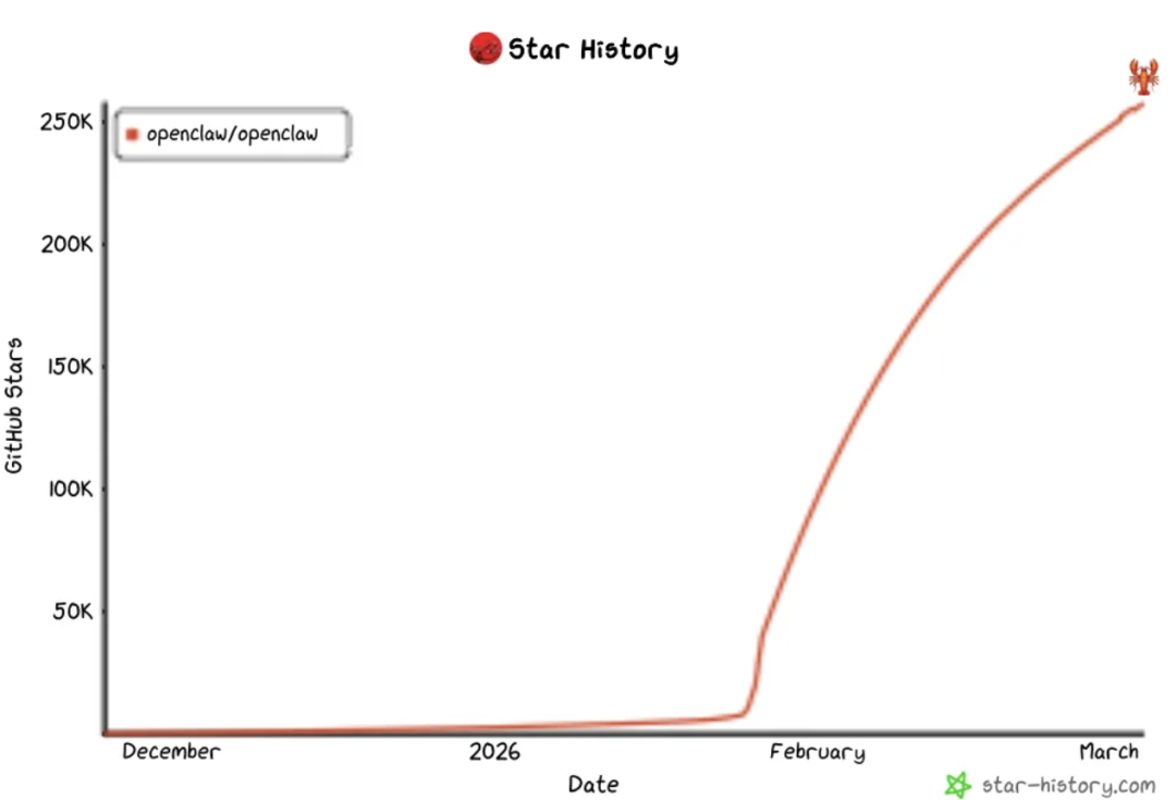 在GitHub开源网站上,Meta旗下的React项目攒下24万颗星,花了十三年,而OpenClaw超越它只用了100天,惹人眼红。