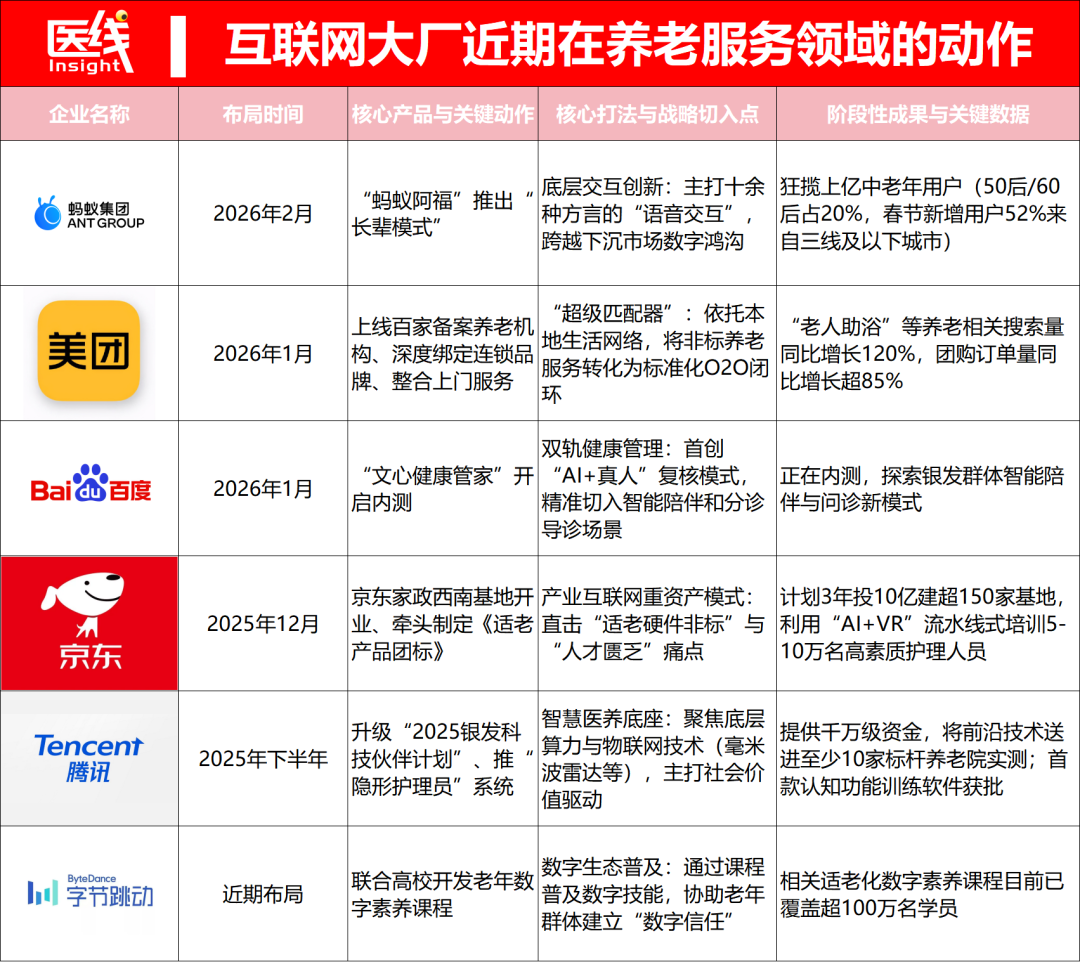可以说,一场史无前例的“养老服务市场卡位战”,正在中国最核心的互联网巨头圈内全面打响。