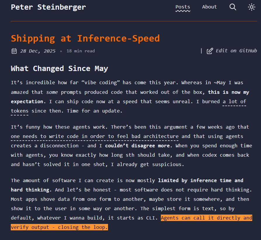 在认识到自己产品的巨大潜力后,这位年仅 39 岁,在上一家公司赚了一亿美元功成身退的 AI 大拿,在个人网站 steipete.me 上兴奋的写道:“Agent 能直接把活干完并验证产出——真正的完成闭环”
