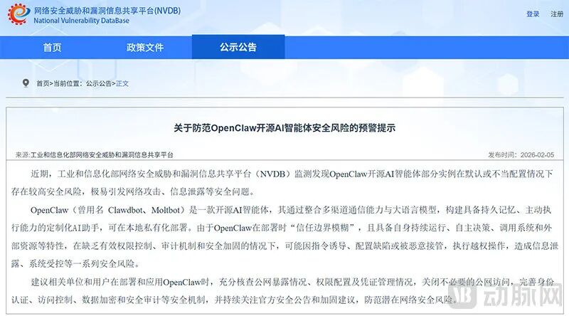 工业和信息化部网络安全威胁和漏洞信息共享平台发布的OpenClaw安全风险预警