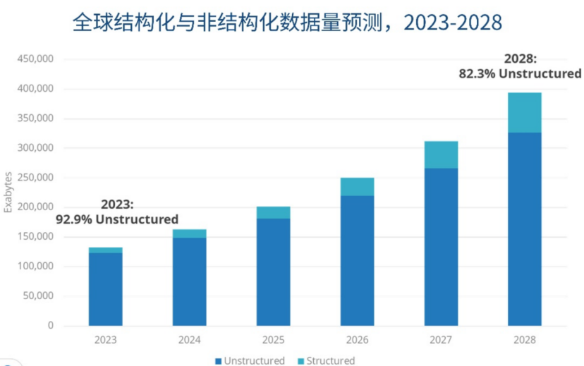 根据IDC 2023年的报告,视频、音频、图片等非结构化数据占到了全球数据总量的92.9%,即便到2028年,这个比例预计也只会降到82.3%。