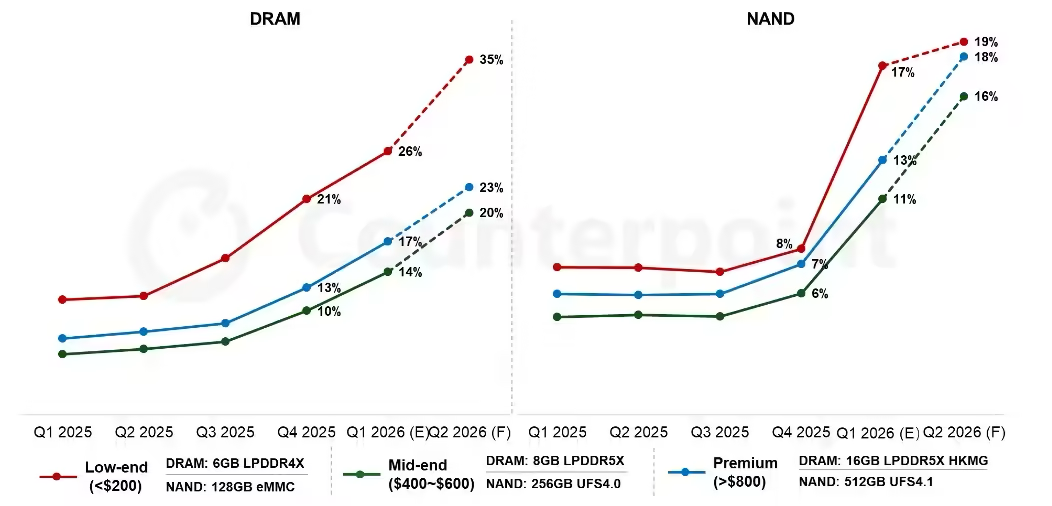 众所周知,2025年下半年以来,因AI算力需求暴增,内存价格飞速攀升。Counterpoint Research披露的研报显示,2026年Q1,移动内存价格持续大幅上涨,其中DRAM价格环比增长超50%,NAND Flash价格环比增长超90%。