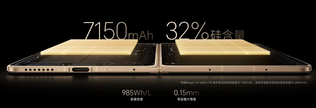2022年1月问世的荣耀Magic V仅搭载了4750mAh电池。四年后问世的荣耀Magic V6(16GB+1TB版)首发搭载全新的青海湖刀片电池,硅含量提升至32%,单层叠片厚度仅为0.15mm,能量密度达985Wh/L,容量高达7150mAh。