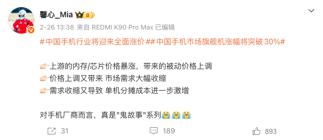 2026年2月26日,REDMI产品经理胡馨心在社交媒体发文称,上游内存、芯片价格暴涨,使得手机价格被动上调;价格上调导致手机需求大幅收缩;需求收缩导致单机分摊成本进一步激增。“对手机厂商而言,真是‘鬼故事’系列。”