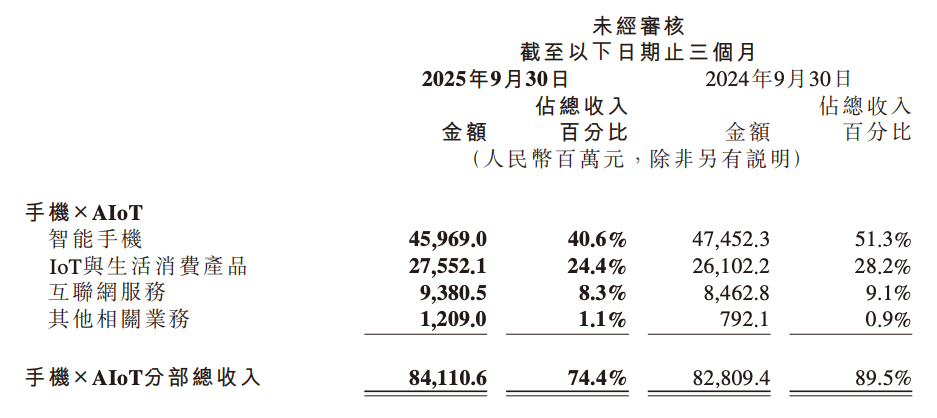 比如,2025年Q3财报显示,小米手机出货量达4330万台,同比增长0.5%。然而,同期小米手机平均售价仅为1062.8元,同比下跌3.6%;毛利率11.1%,同比减少0.6个百分点。因出货量涨幅难以平衡价格跌幅,该季度小米手机业务营收460亿元,同比下跌3.1%。