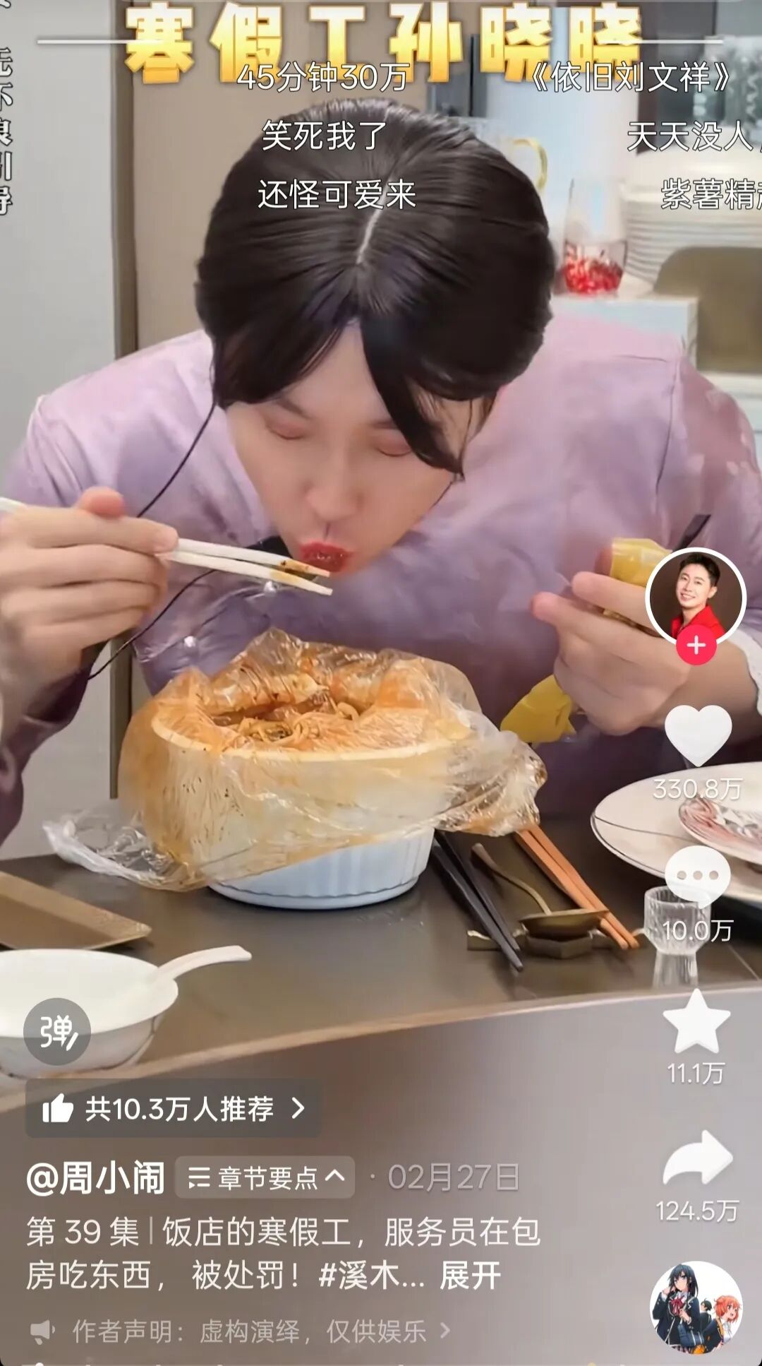 抖音平台上周小闹塑造的角色“紫薯精”在吃刘文祥麻辣烫。