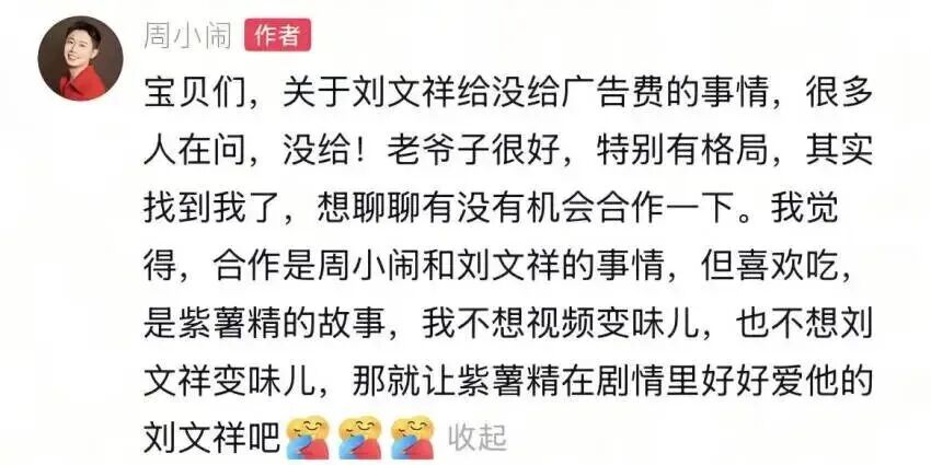 周小闹在回应时表示:“其实找到我了,想聊聊有没有机会合作一下。我觉得,合作是周小闹和刘文祥的事情,但喜欢吃,是紫薯精的故事。我不想视频变味儿,也不想刘文祥变味儿。”