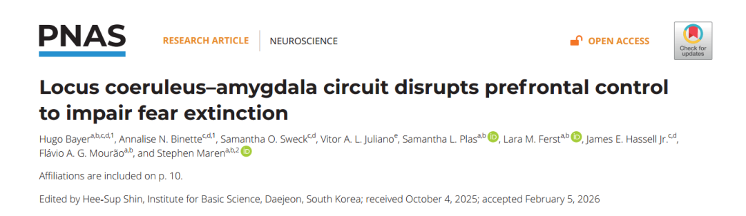 2026年3月11日,美国伊利诺伊大学Stephen Maren团队在《PNAS》上发表的研究,追踪到了答案:应激激活了蓝斑→杏仁核通路,让本该被抑制的前额叶皮层彻底紊乱了。