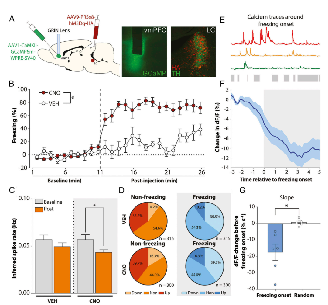 同时,他们用钙成像监测腹内侧前额叶皮层(vmPFC)——大脑里负责抑制恐惧的脑区。发现vmPFC神经元的放电频率显著降低。