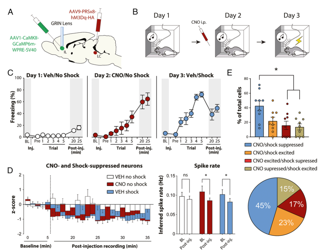 他们对比了蓝斑激活和足底电击(经典应激源)的效果,结果显示,两者都让大鼠产生强烈的恐惧僵直行为;两者都抑制了vmPFC的神经活动;大部分vmPFC神经元对两种刺激的反应一致,均表现为放电减少。