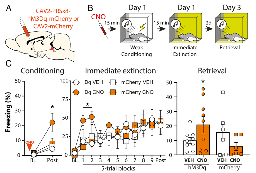 研究者用化学遗传学激活大鼠的蓝斑核(LC)——大脑里释放去甲肾上腺素、负责应激反应的核心脑区。结果大鼠出现强烈的恐惧僵住行为。