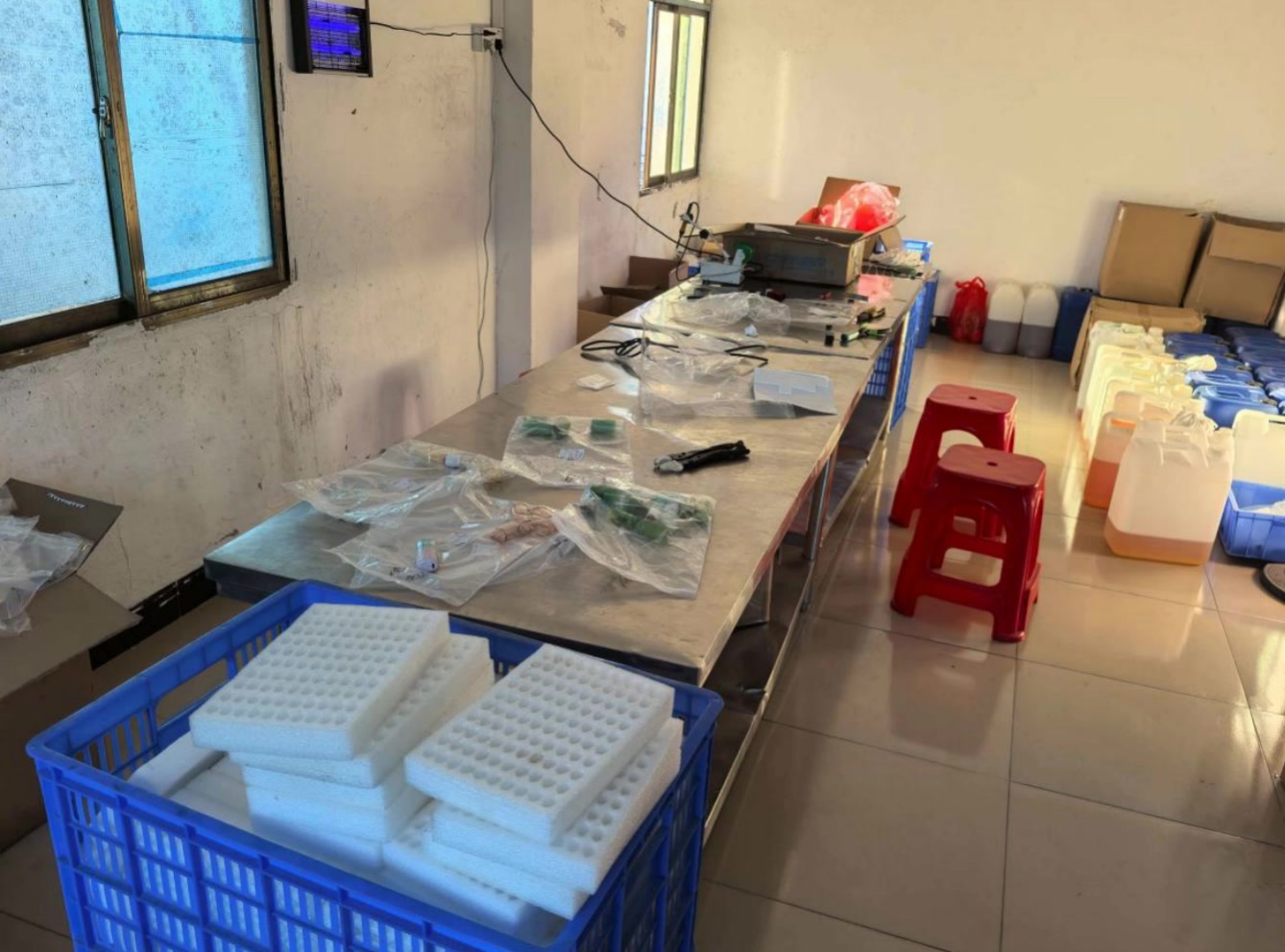 2025年12月,广东惠州一处藏匿于简陋民房中的制假窝点被执法部门捣毁。现场环境触目惊心:墙壁发霉、地面脏污,劣质烟油桶随意堆放,缺乏基本卫生条件。工人甚至穿着人字拖、赤膊进行烟油灌装。该窝点大量制造假冒水果味烟弹及印有英文标识的伪劣产品,冒充海外货源。行动中累计查获假冒烟弹82689个、烟具1063个。