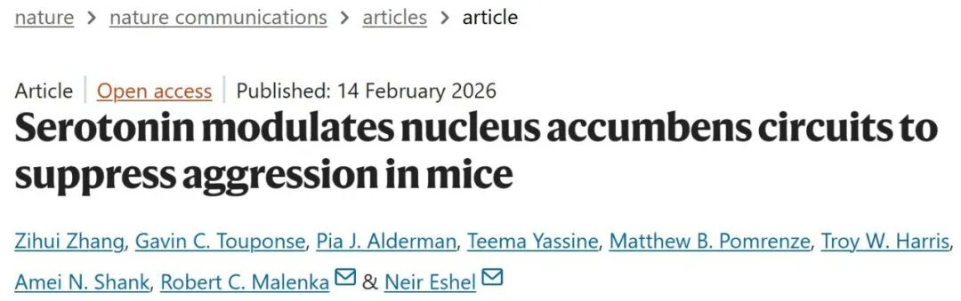 基于此,2026年3月9日,斯坦福大学Neir Eshel研究团队在国际著名期刊《Nature Communications》杂志发表了“Serotonin modulates nucleus accumbens circuits to suppress aggression in mice”揭示了血清素调节伏隔核环路以抑制小鼠的攻击行为。