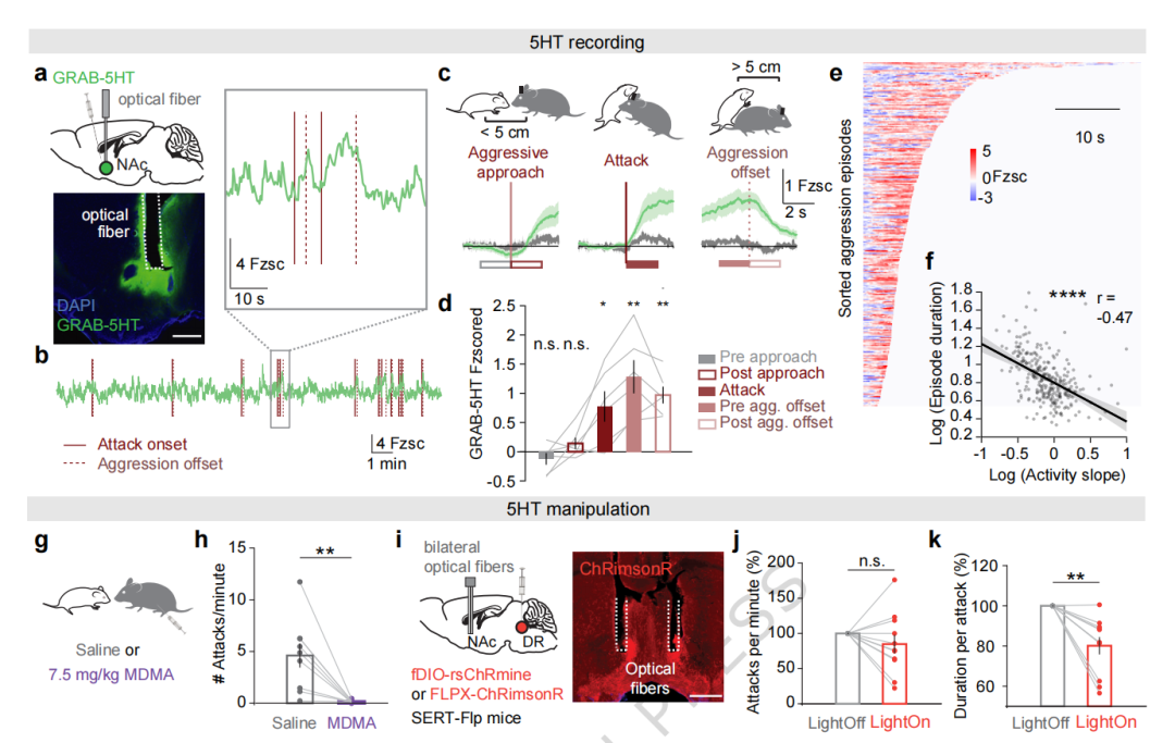 通过在双转基因雄性小鼠中综合运用光纤记录、光遗传学及自由活动微型显微镜钙成像技术,作者发现:在攻击行为发生过程中,伏隔核(NAc)内的血清素(5-HT)水平呈现动态升高趋势并通过靶向抑制特定的D1型中等棘状神经元(D1-MSNs) 亚群,发挥“行为刹车”的作用以遏制攻击冲动。该研究揭示了血清素通过精确调控伏隔核输出通路来限制攻击行为的新型神经调节机制,为理解冲动控制的环路逻辑提供了重要证据。