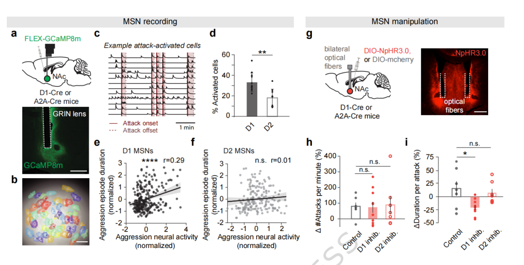 实验发现,虽然伏隔核内的D1型和D2型神经元在攻击期间活性均有升高,但只有D1型神经元的活跃程度与攻击持续时间呈正相关。
