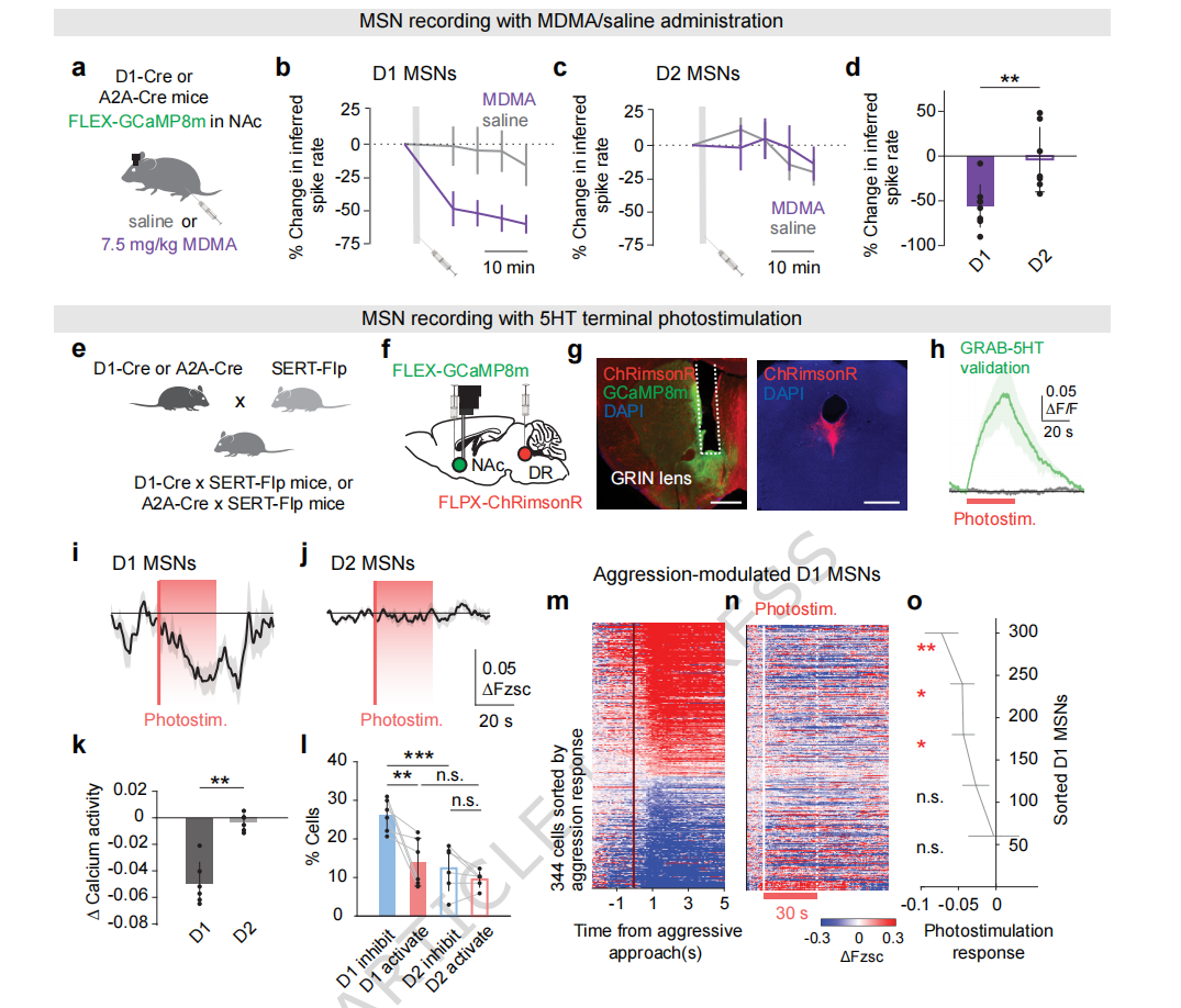 研究人员发现,无论是给予MDMA还是利用光遗传学手段直接激活血清素输入,都会特异性地降低D1型神经元的活性。