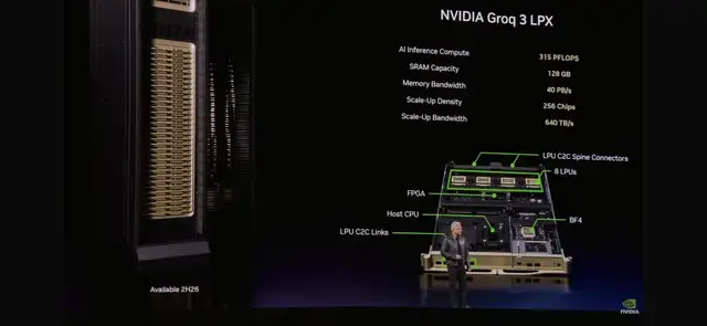 英伟达构建了包含256个Groq 3 LPU的Groq 3 LPX机架。该机架提供128GB的SRAM和40 PB/s的推理加速带宽,并通过每个机架640 TB/s的专用扩展接口将这些芯片连接起来。