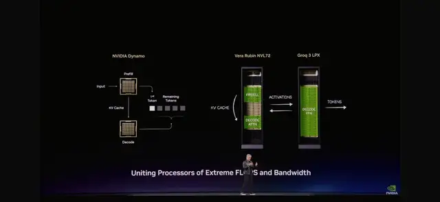 两种处理器的统一:LPU + Vera Rubin。“我们想出了一个绝妙的主意,”黄仁勋解释道,“我们将推理过程完全重新架构。我们把适合Vera Rubin的工作放在Vera Rubin上,然后把解码生成、低延迟、带宽受限的部分卸载到LPU上。”
