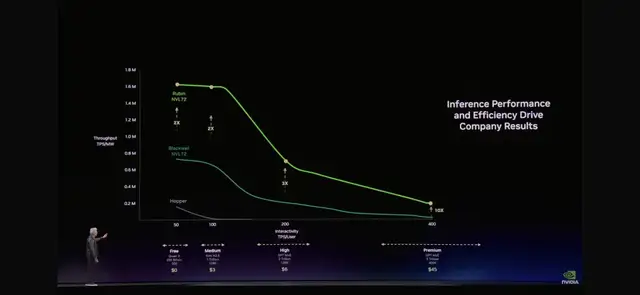 “就像任何行业一样,"黄仁勋解释道,"更高的质量,更高的性能,更低的容量。Grace Blackwell在你的免费层提升了巨大吞吐量,但在你最能变现的层级,它提升了35倍。Vera Rubin又在这个基础上提升了10倍。