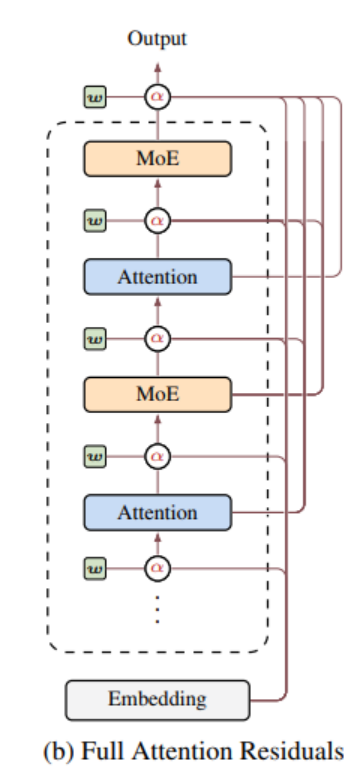 思路是把所有层分成若干个块,每个块内部仍然使用传统的残差连接做求和,但块与块之间使用注意力机制来做选择性聚合。这样需要存储和传输的不再是每一层的输出,而是每个块的汇总表示,内存占用从 O(Ld)降到了 O(Nd),其中 N 是块的数量,通常只有8个左右。