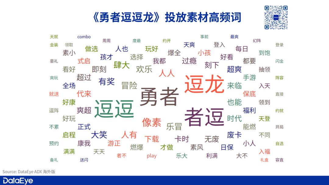 由于只出海港澳台市场,《勇者逗逗龙》投放素材的Top100高频词均为繁体中文,其中除了游戏名外,”像素“”过瘾“”欢乐“”福利“”保底“均是文案热词,多聚焦强调游戏的欢乐体验与福利丰富。