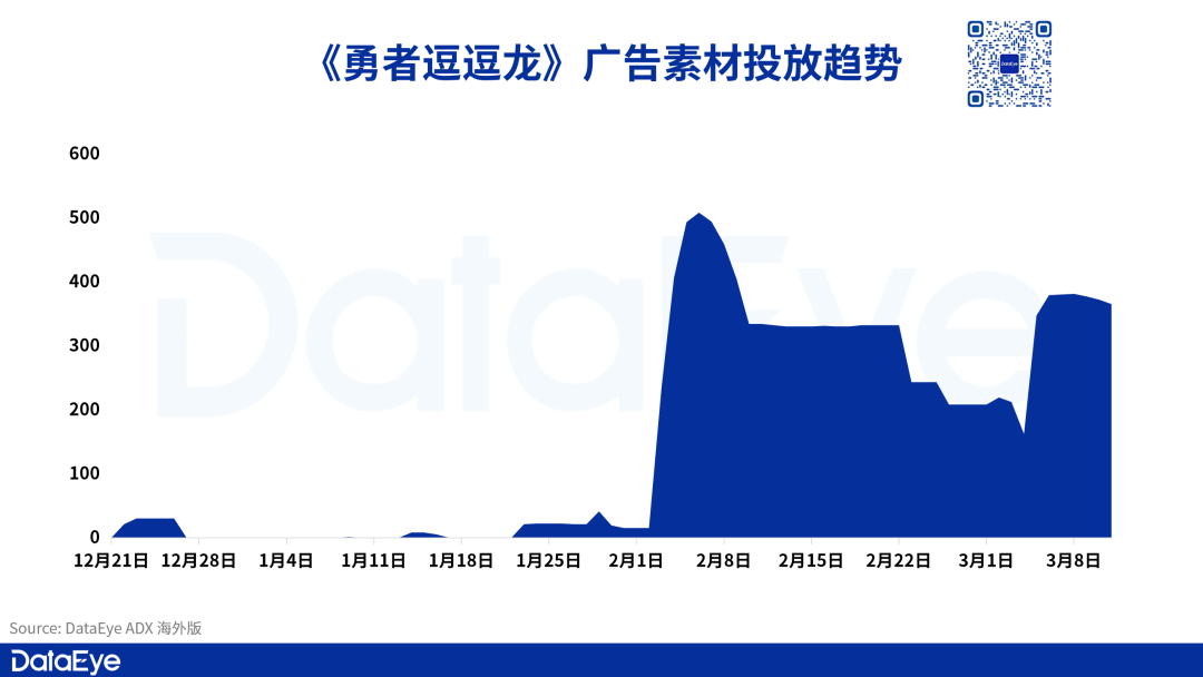 DataEye-ADX海外版显示,《勇者逗逗龙》最初在去年年底上线预约时开启过少量广告素材投放,紧接着在今年2月正式开启大规模广告投放,上线后日均投放素材数超过300组。目前仍未有放缓趋势。