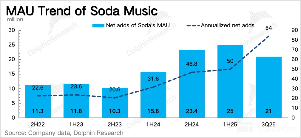 截至 26 年初,汽水音乐整体用户规模 MAU 已经达到 1.4 亿,进一步缩小与云音乐的差距。但粘性更高(日常抖音流量贡献 80%+)的汽水音乐,近 5000 万的 DAU 早就超过了云音乐,目前已经非常接近独立的 QQ 音乐或酷狗音乐。假设按照 QQ 音乐的用户粘性 DAU/MAU 来换算腾讯音乐整体的 DAU 规模,也就是 28% 的用户粘性对应 28%*5.6 亿,近 1.6 亿的日活,是汽水音乐的 3 倍。