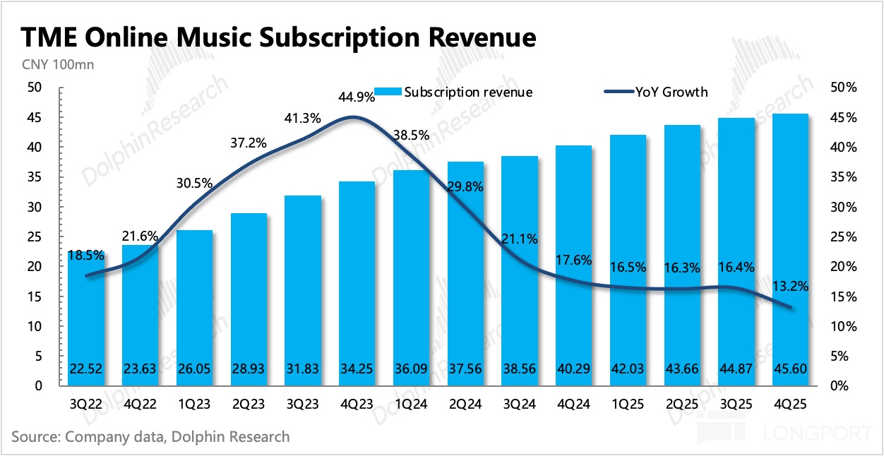 北京时间 3 月 17 日港股盘后、美股盘前,$腾讯音乐(TME.US) 发布了 2025 年第四季度财报。Q4 业绩好坏参半,第二曲线继续发力,但用户生态不稳,致使订阅收入增长降速,因此海豚君总体观感不佳。