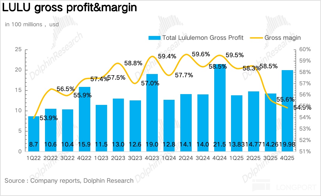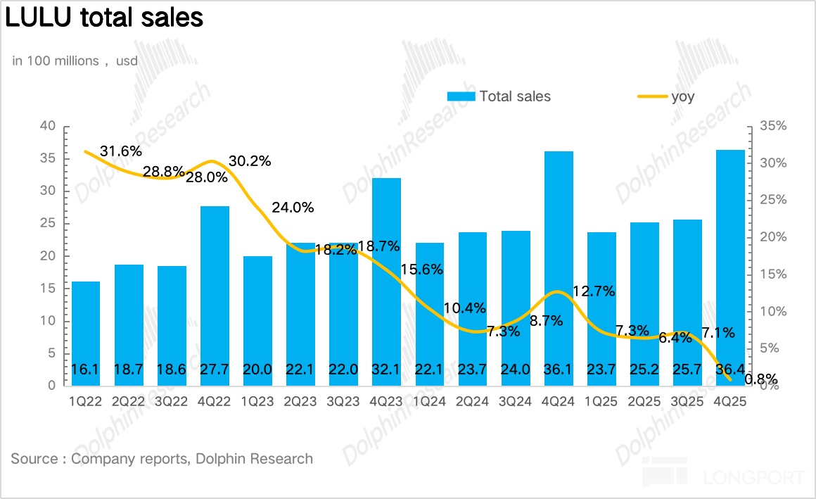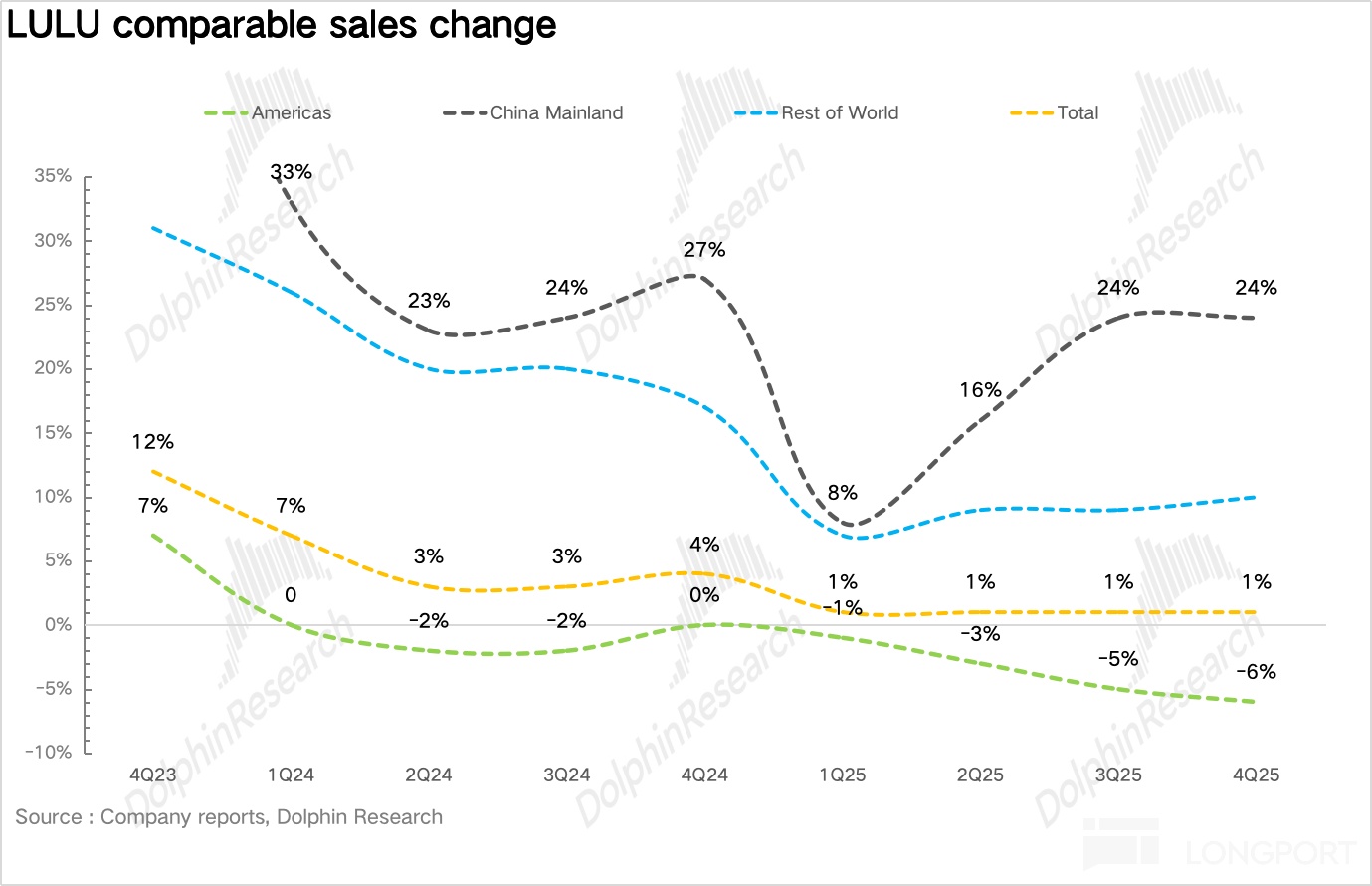 4Q25Lululemon 实现营收 36.4 亿美元,同比增长 0.8%,趋势上增速仍在放缓,增速为近 3 年以来最低水平。如果剔除去年同期多出的额外一周的影响,实际营收同比增长 6%,但也远低于过去几年 15% 以上的高速增长水平,核心还是北美大本营市场陷入了增长停滞。