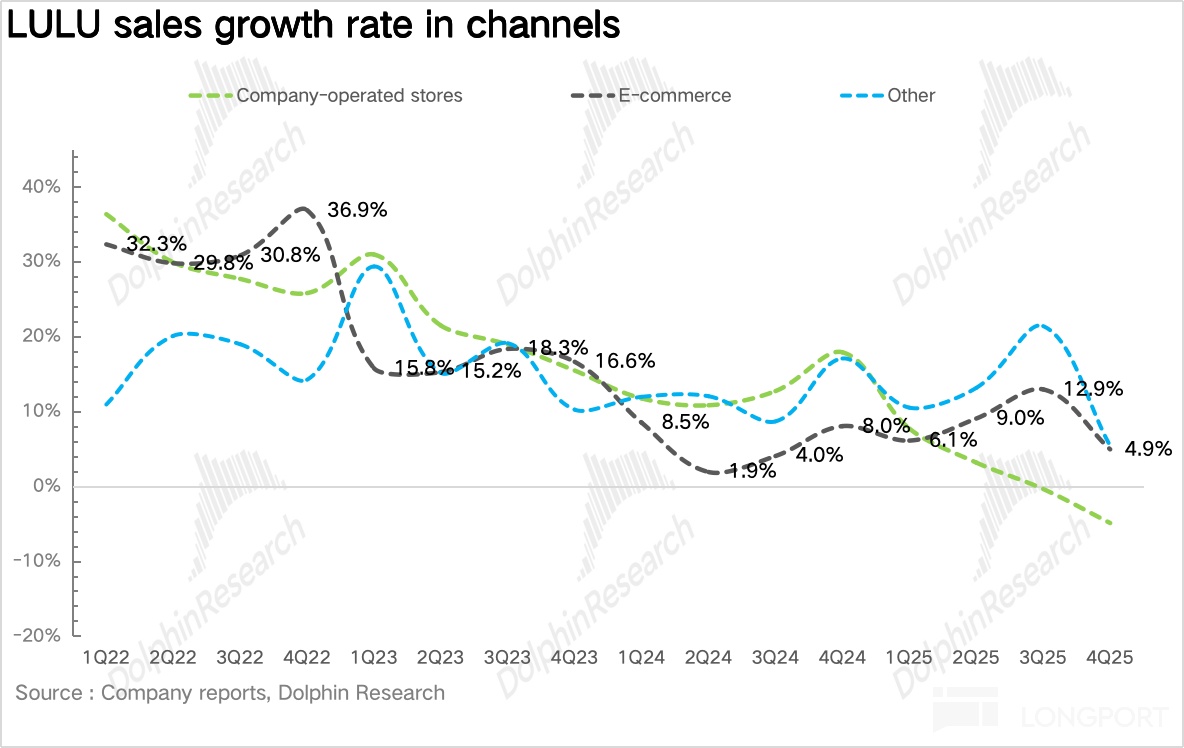 4Q25 男装同比增长 3%,表现一般。具体到品类上来看,在男装上,Lululemon 明显加大了专业场景的拓展,包括高尔夫、专业训练等细分赛道的产品,在海豚君看来,背后明显的意图在于刻意弱化 “瑜伽品牌” 的固有标签,将男装定位成更具体的性能赛道。