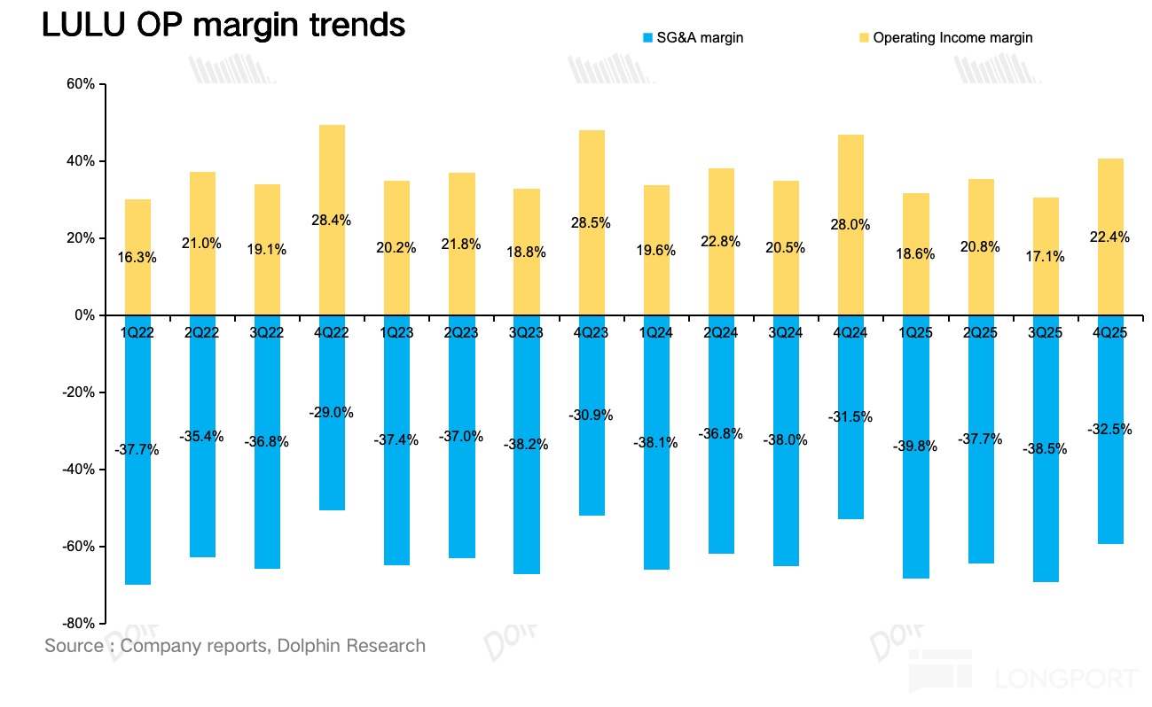 一方面,受到关税的冲击以及最低免税额取消(8 月份生效),公司整体供应链成本显著抬升,另一方面,lululemon 在 Q4 加大了在北美 “We Made Too Much” 渠道的折扣力度,虽然避免了库存积压,但也牺牲了一部分利润,公司毛利率同比大幅下滑 4.6pct。