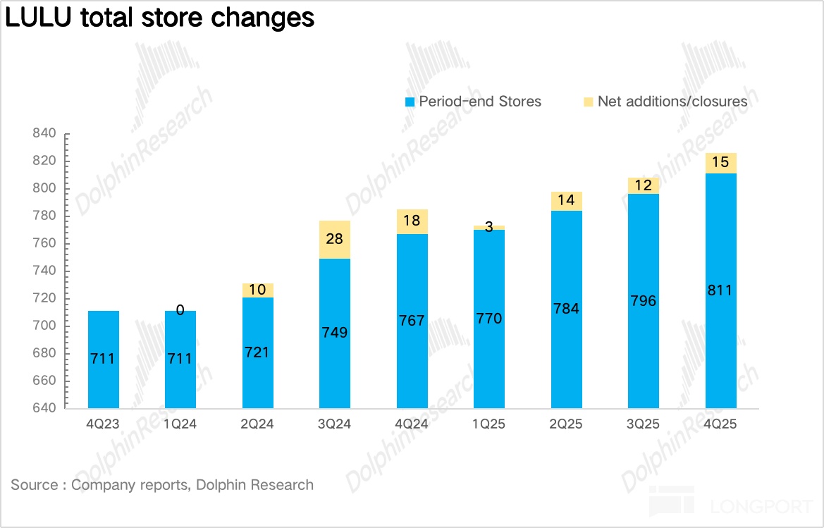 截至 4Q25,公司全球门店总数达 811 家,环比净新增 15 家,其中中国地区为开店主力,策略上以大店为主,除了在京沪等一线城市加密布局外,Lululemon 在 Q4 密集进驻了更多省会城市及核心二三城市(如昆明、徐州、呼和浩特等),另一方面,Lululemon 也针对老旧门店进行了扩容,搬迁到商场更核心、面积更大的位置,来展示全系列的鞋履、男装和高尔夫系列产品。
