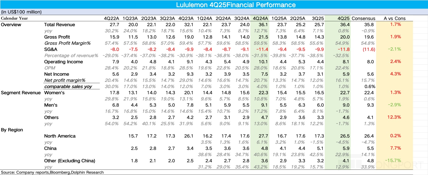 1、营收小幅超出市场预期。4Q25Lululemon 营收同比增长 0.8%,趋势上增速仍在放缓,增速为近 3 年以来最低水平。如果剔除去年同期多出的额外一周的影响,实际营收同比增长 6%,但也远低于过去几年 15% 以上的高速增长水平,核心还是北美大本营市场陷入了增长停滞。
