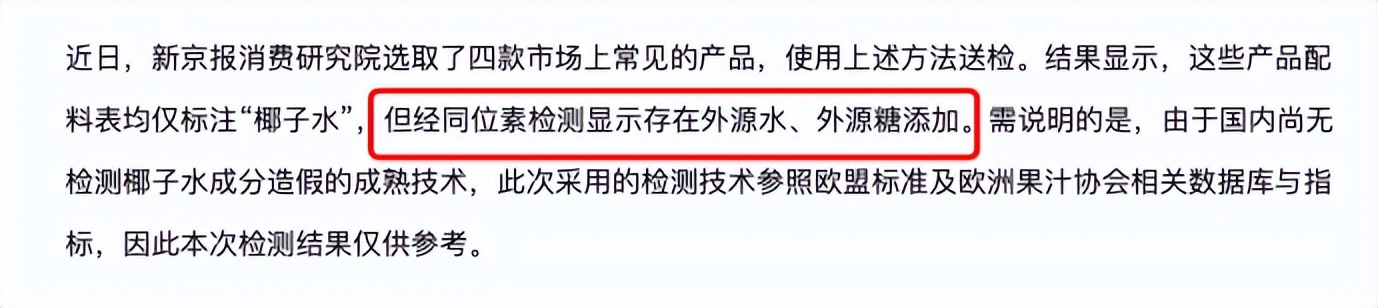 椰子水本身自带天然甜味,口感区间宽泛,即便加入外源糖或进行稀释,也很难通过味觉直接识别。这就导致过去所有争议,都难以从“感觉”走向“证据”。