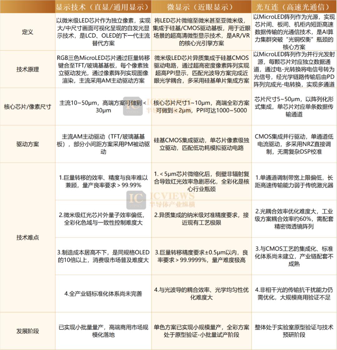 MicroLED全称Micro Light Emitting Diode(微发光二极管,又称μLED),是一种微米级无机半导体自发光技术,行业通用标准将其定义为单颗边长<100μm(主流量产规格<50μm)的无机LED发光芯片,可作为独立可寻址单元,通过精准集成实现高效光电转换。其极简结构去除了传统显示技术的冗余层,核心优势集中于光电性能的极致优化,为光互连、CPO光模块应用奠定基础。