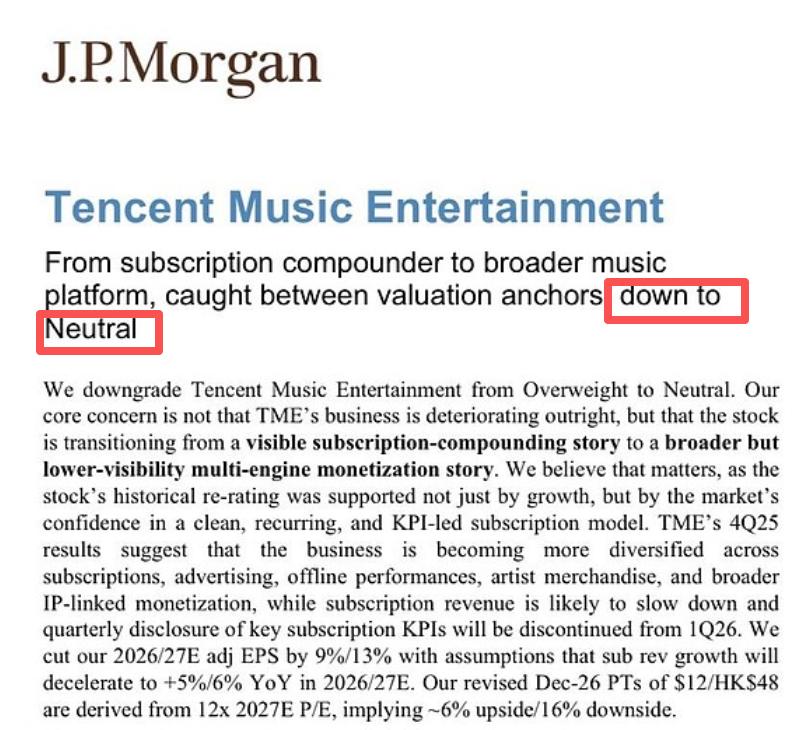 摩根大通还补了一刀,它把腾讯音乐评级从“增持”直接下调至“中性”,美股目标价从30美元腰斩至12美元。理由是:投资逻辑从“清晰的订阅复利”转向“模糊的多元引擎”,市场需要时间重新锚定估值。
